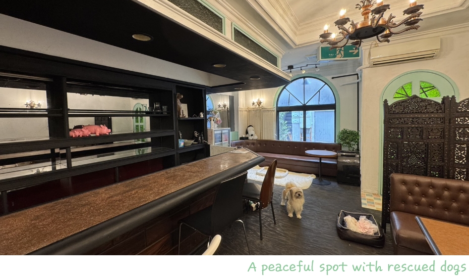 カフェには、超小型犬から超大型犬まで、個性豊かな保護犬たちがのんびりと暮らしています。