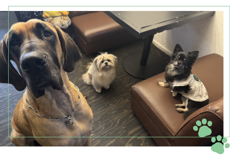 超小型犬〜超大型犬まで、その日ごとに性格や相性を見て出勤するワンちゃんたちが集合。